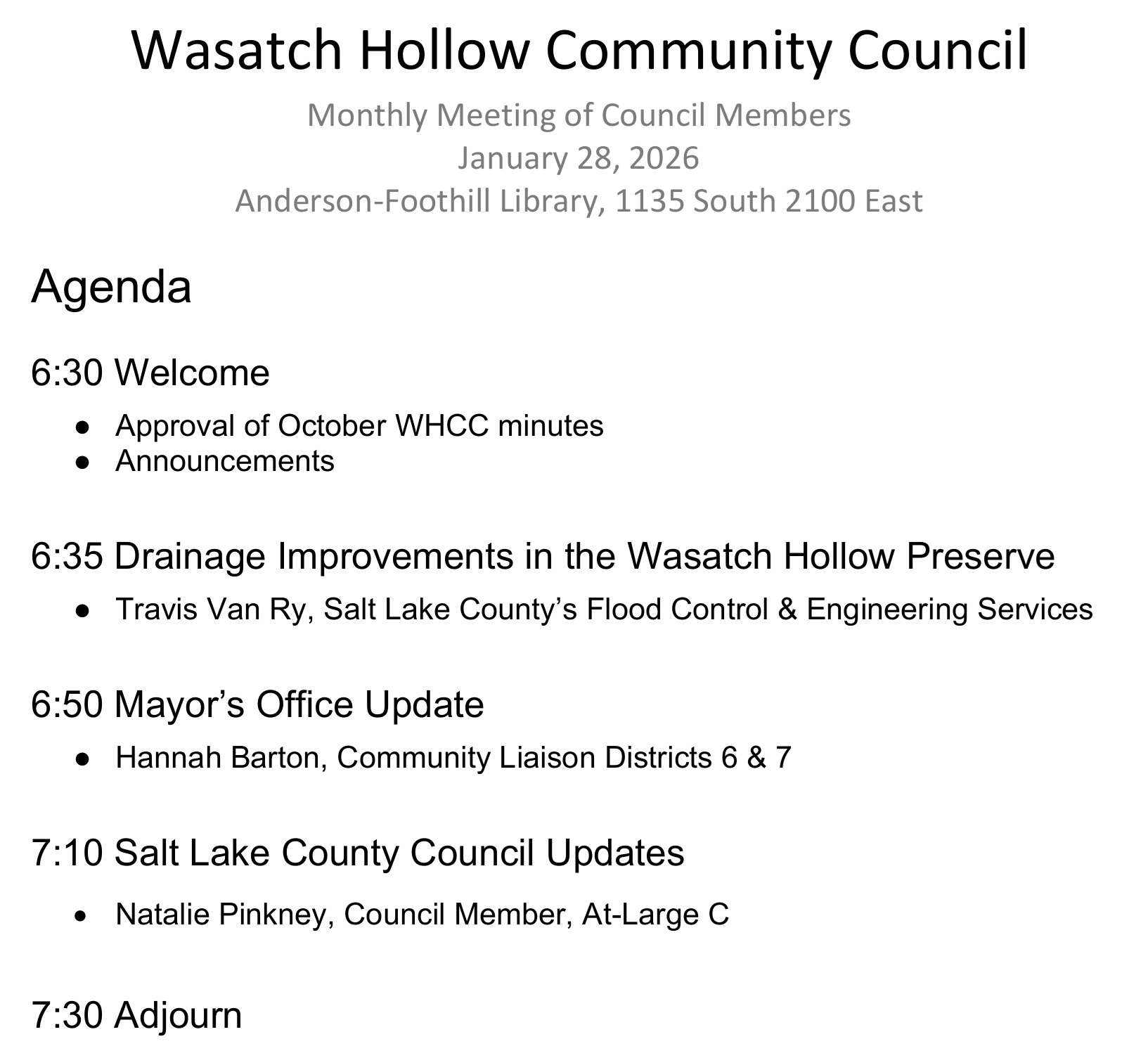 28jan6:30 pm8:00 pmJanuary 2026 Council Meeting6:30 pm - 8:00 pm(GMT+00:00) Anderson Foothill Library, 1135 S 2100 E, Salt Lake City, UT 84108